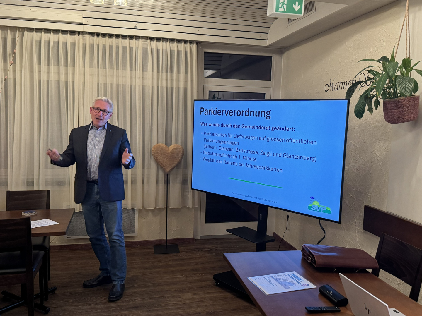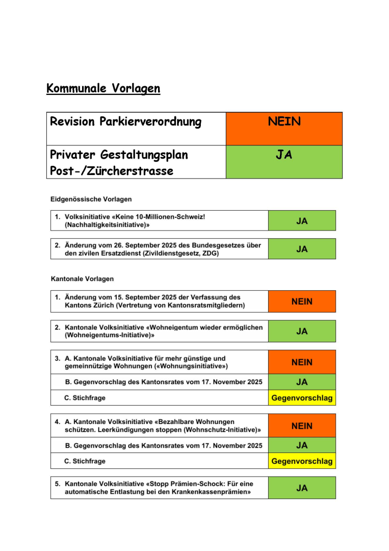 Am 1. April 2026 (kein Aprilscherz) pünktlich um 19.00 Uhr startete die Parteiversammlung im Restaurant Heimat. Der vorgängig offerierte Apéro wurde durch die gewählten bisherigen und neuen Gemeinderäte und Stadträte übernommen. Gastreferent Kantonsrat Paul Mayer kam mit dem ÖV nach Dietikon, weil mit dem Gubrist wäre es unmöglich gewesen von Marthalen nach Dietikon rechtzeitig einzutreffen. Die zwei eidgenössischen Vorlagen betrafen die «Keine 10-Millionen-Schweiz! – Nachhaltigkeits-Volksinitiative» und das «Bundesgesetzes über den zivilen Ersatzdienst (Zivildienst)», die von Kantonsrat Rochus Burtscher vertreten wurden. Bei der Nachhaltigkeits-Volksinitiative wurde engagiert diskutiert und am Schluss war die Parolenfassung klar: einstimmig JA. Die Zivildienstvorlage war im Grundsatz ebenfalls klar, aber viel schwieriger zu verstehen - dennoch stimmte die Versammlung klar JA.