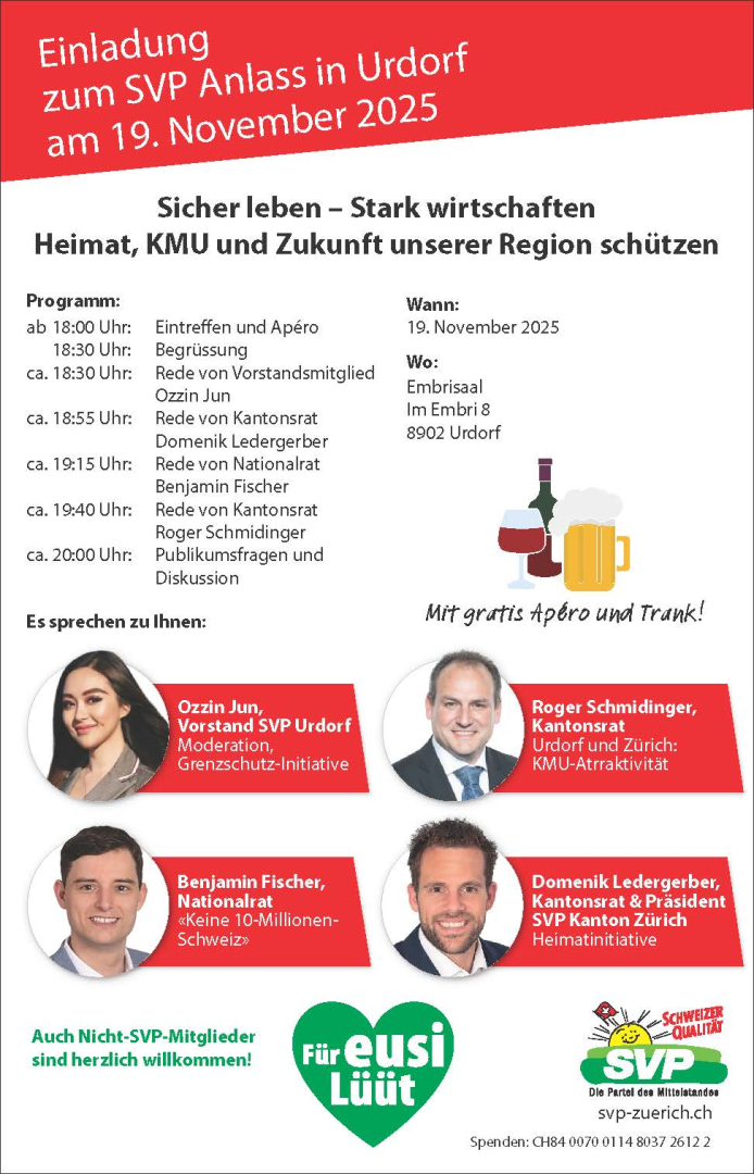 19. November 2025, 18:00 - 21:00Politdiskussion in Urdorf mit Ozzin Jun, KR Roger Schmidinger, NR Benjamin Fischer und KR Domenik Ledergerber (Parteipräsident) zu aktuellen Themen
