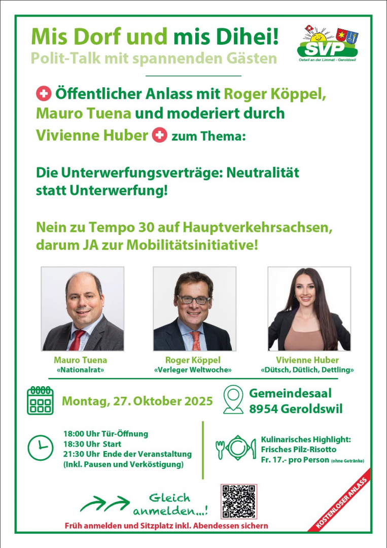 27. Oktober 2025, 18:00 - 22:00Öffentlicher Anlass mit aNR Roger Köppel, NR Mauro Tuena zum Thema: Die Unterwerfungsverträge: Neutralität statt Unterwerfung